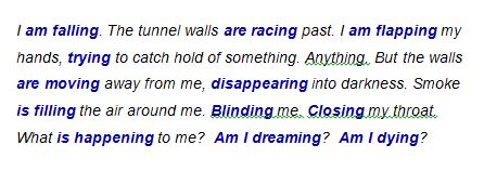 falling1 (Actually, that’s a bit of a cheat, because the short, irregular sentences and the close proximity of the verbs both increase the pace and counter the reduction of pace inherent in the CONTINUOUS ASPECT)